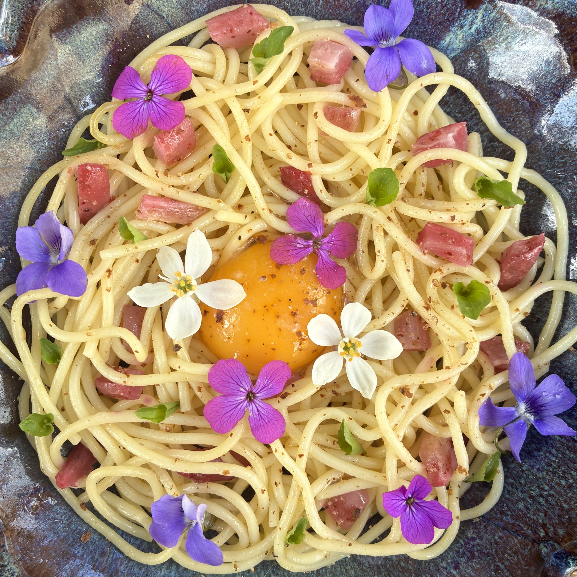 Enfin, décorez avec des feuilles et fleurs comestibles : ici fleurs de monnaie du pape, feuilles et fleurs de violettes du jardin sauvage du @domaine_d_larthe (fleurs d'oranger du Mexique pour la décoration uniquement).