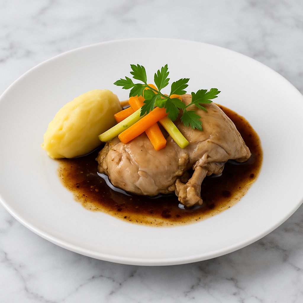 Poulet fermier en vinaigrette de légumes et purée de pommes de terre
