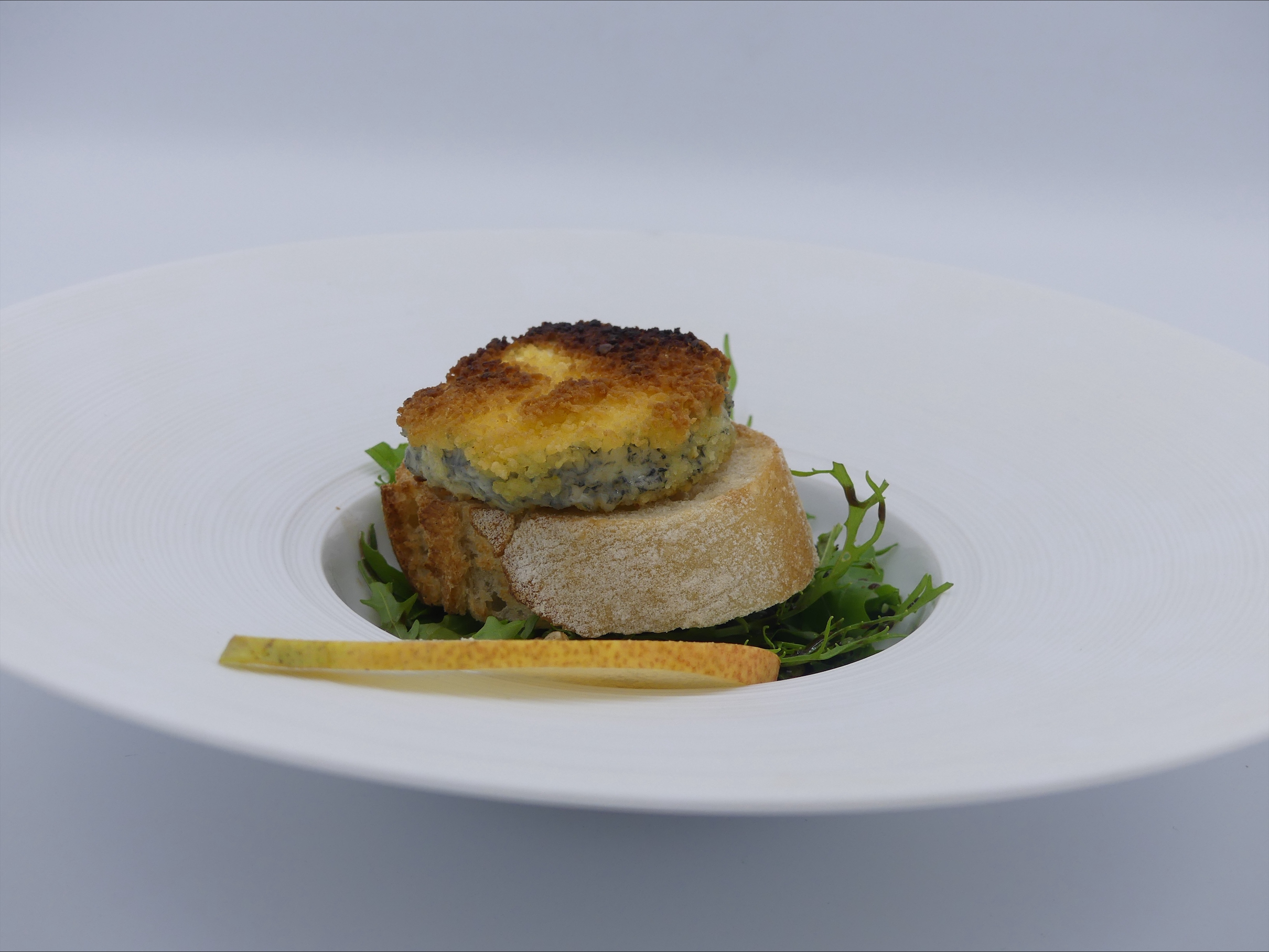Dans une grande poêle anti-adhésive, mettre une cuillère à soupe d’huile de pépin de raisin Vigean et le beurre. Faire chauffer jusqu’à un début de coloration du beurre, ajouter les tranches de fromages panées et les faire colorer des deux cotés.